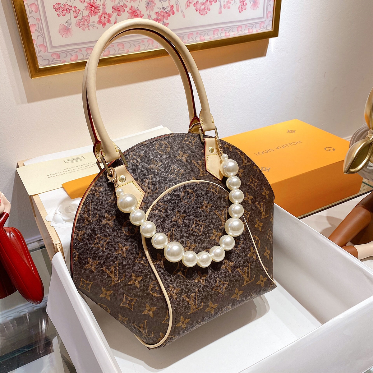 Túi xách Lv dáng bầu hoa nâu quai da kèm ngọc trai