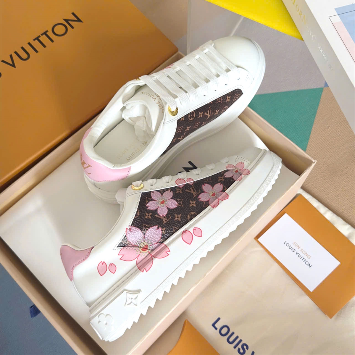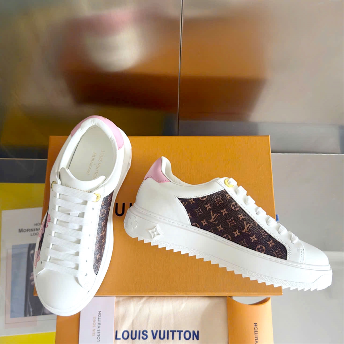 Giầy thể thao nữ trắng phối da hoa nâu đào Louis Vuittion siêu cấp